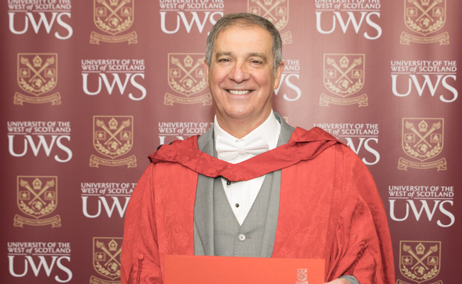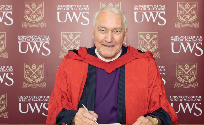 The Honorary Degree of Doctor of the University was conferred on 15th November 2023 at Paisley Abbey in recognition of his significant accomplishments as a local businessman and with his charity work.