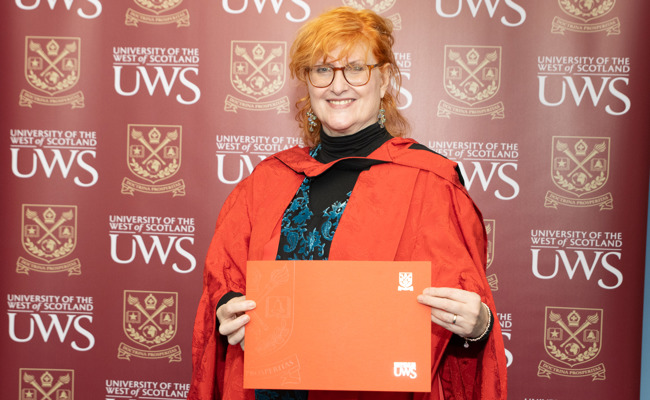 The Honorary Degree of Doctor of the University was conferred on 16th November 2023 at Paisley Abbey in recognition of her significant work as a campaigner, activist and an ambassador towards stalking specific crimes and support for victims.